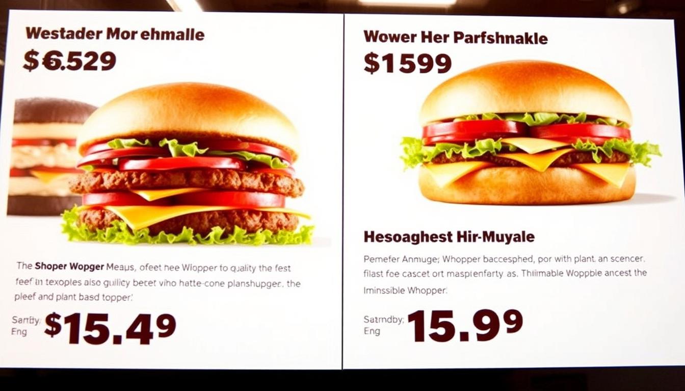 The Whopper Meal is a famous item, costing $15.49. There’s also a Double Whopper Meal for $16.79. These meals show the brand’s focus on quality with grilled beef and fresh toppings. They also have the Impossible Whopper for those who prefer plant-based options.